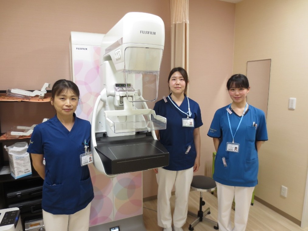 令和5年3月にマンモグラフィ撮影装置が新しくなり、FUJI FILM社製『AMULET Innovality』が導入され稼働しています。女性の診療放射線技師が撮影を行っており、病気の早期発見や装置の精度管理に努めております。令和7年度より新たに新人女性技師が1名加わったことで、3名体制で業務を行っています。検診マンモグラフィ撮影の専門認定を受けたスタッフも多数所属しており、安心安全に検査を受けていただけるよう日々努めております。